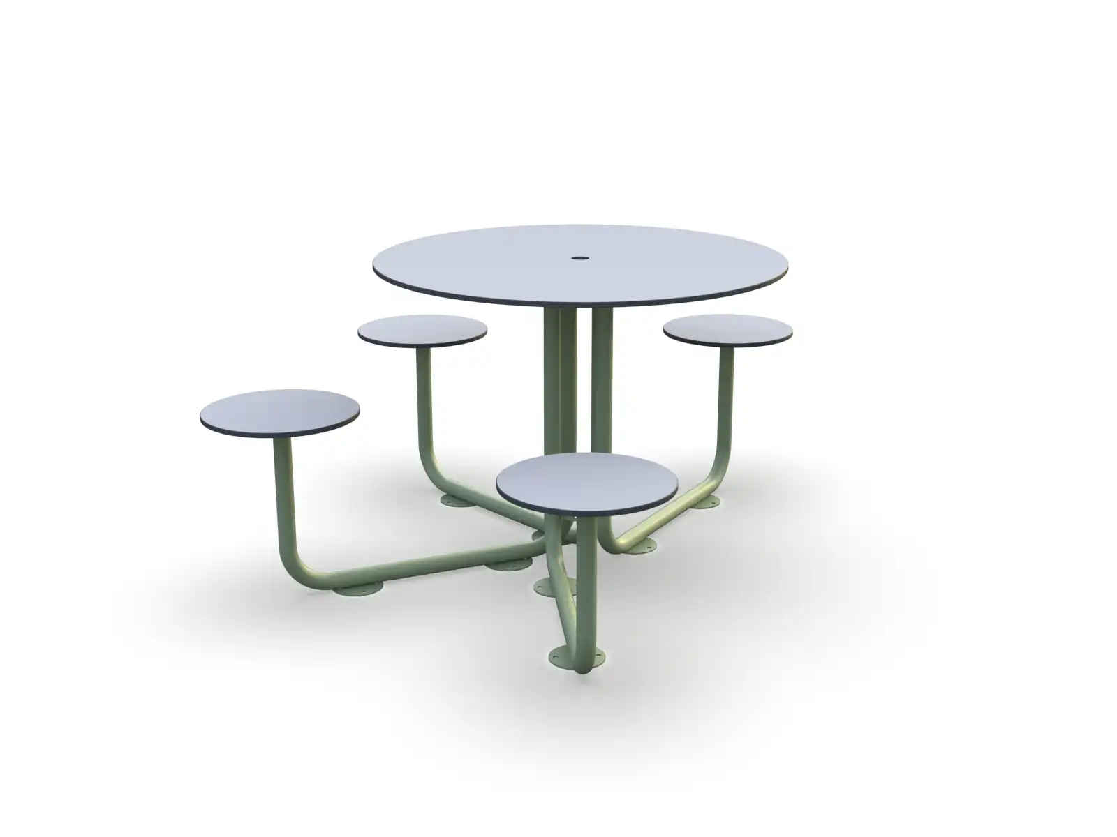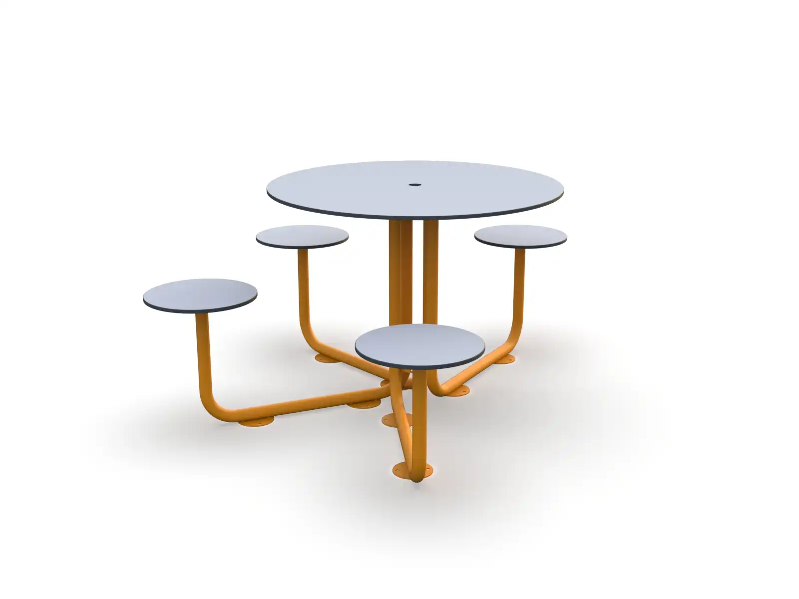 Moderný exteriérový piknikový stôl do parkov a verejných priestorov. Konštrukcia je vyrobená z oceľových pozinkovaných rúr o 40x2 mm a 89x2 mm a uzavretého profilu 30x30 mm. Doska stola o 950 mm a dosky sedadiel o 350 mm sú kompaktné dosky s hrúbkou 12 mm. Do stredu stola je možné umiestniť aj slnečník. Na skrutkovanie.