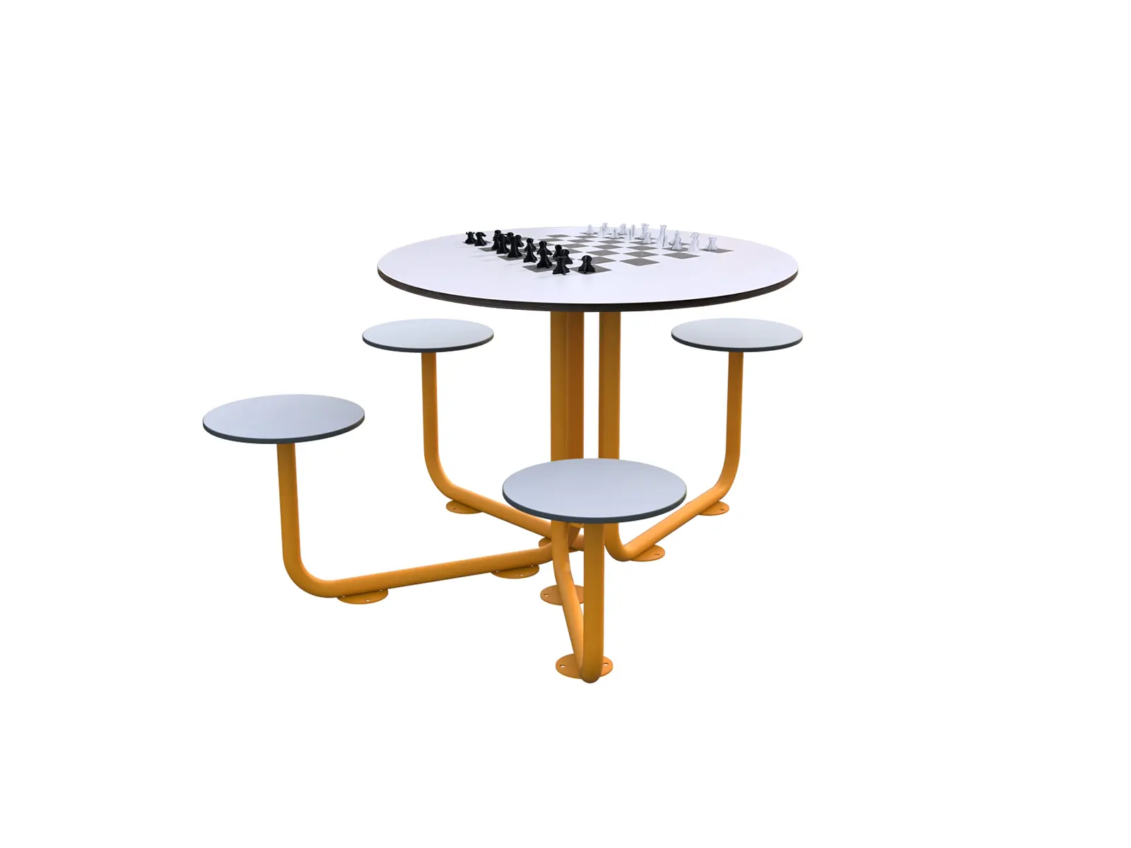 Moderný exteriérový šachový stôl do parkov a pre verejné priestranstvá. Rámová konštrukcia je vyrobená z pozinkovanej oceľovej rúrky o40x2 mm a o89x2 mm, ako aj z uzavretého profilu 30x30 mm. Stolová doska s priemerom o950 mm a sedacie dosky s priemerom o350 mm sú vyrobené z 12 mm kompaktnej dosky odolnej voči vode a UV žiareniu. Na stolovej doske sa nachádza frézovaná šachovnica. Výrobok vyrábame v prevedení na upevnenie skrutkami.