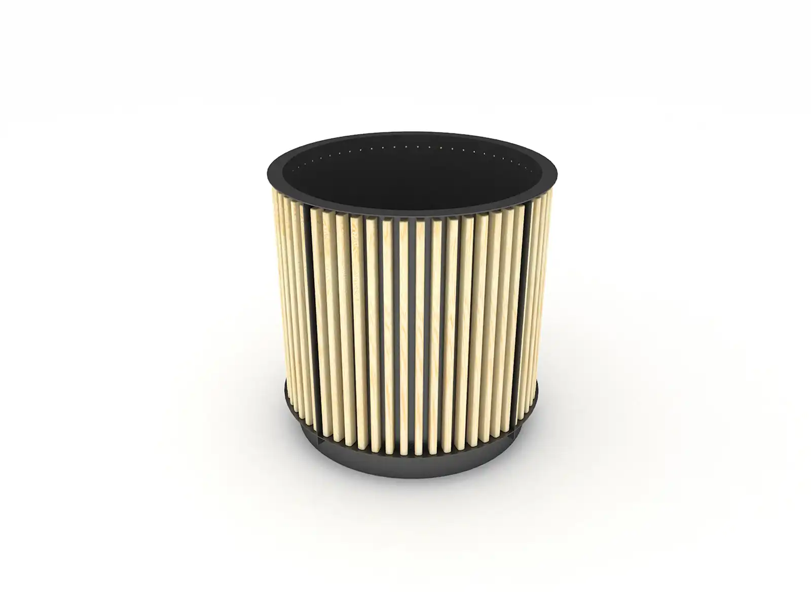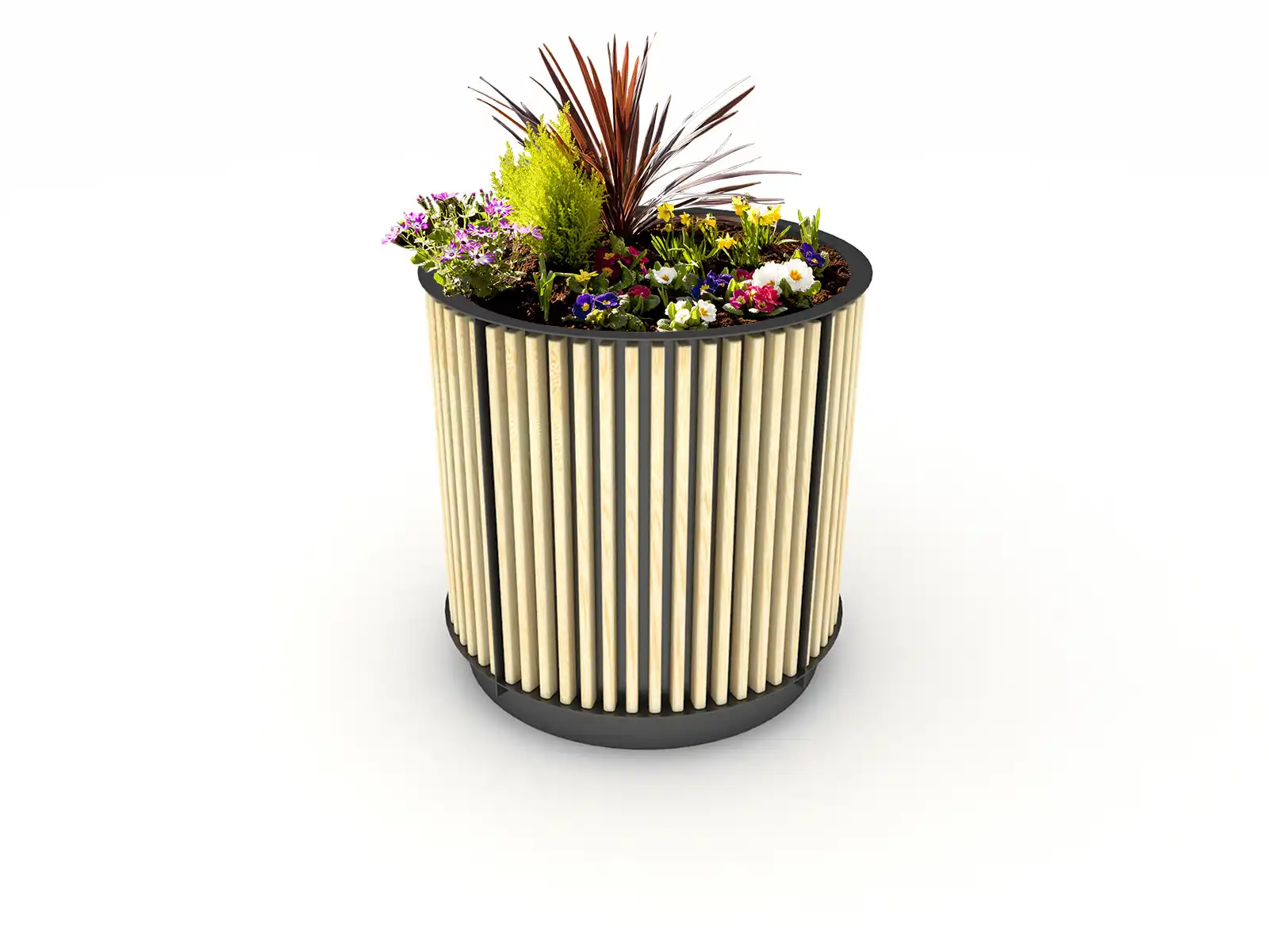 Kruhový kvetináč Cube, pozinkovaná konštrukcia obložená dubovým drevom.