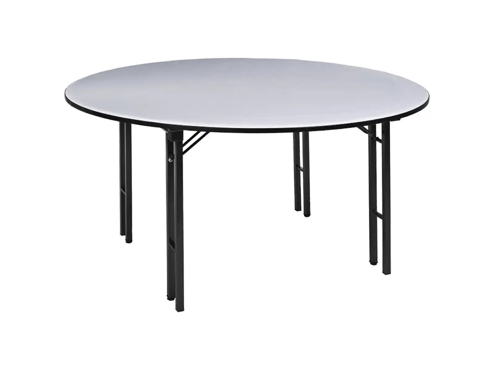 Skladacia, 4-nohy, oceľová stolová podnož s 19 mm hrubou plastovou stolovou doskou a PVC hranou. Na doske stola je tenká vrstva peny.