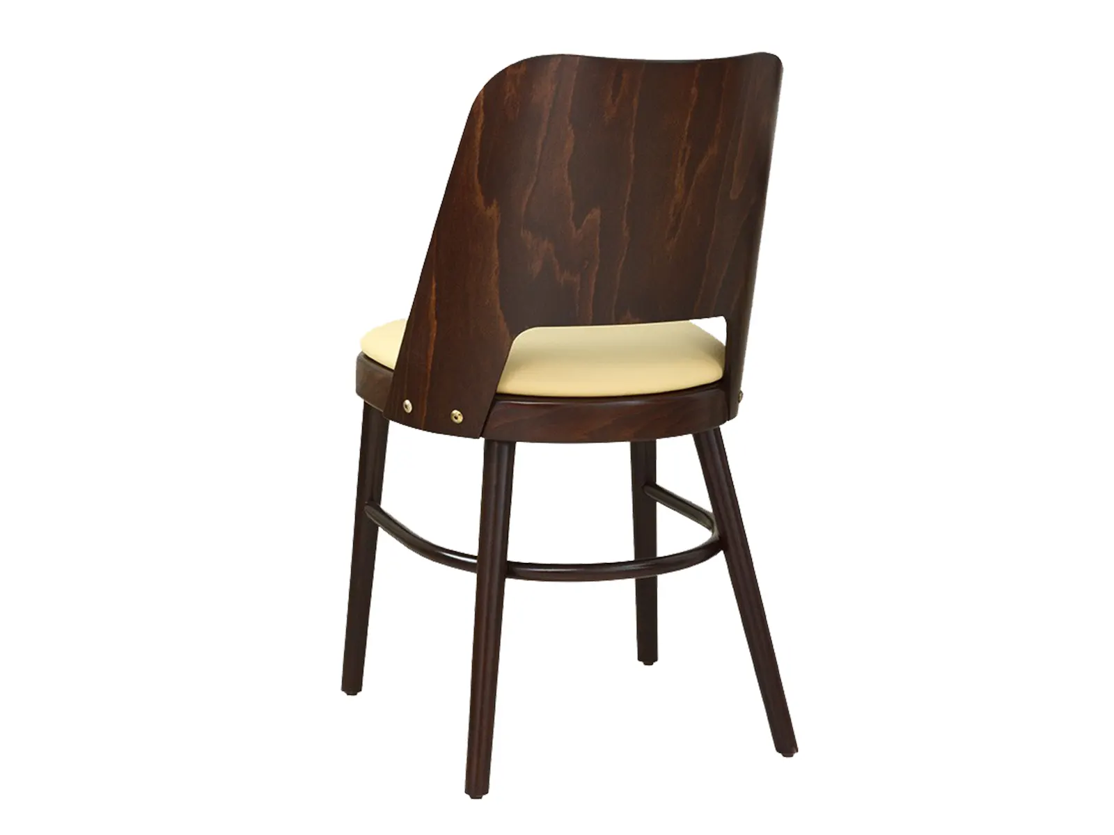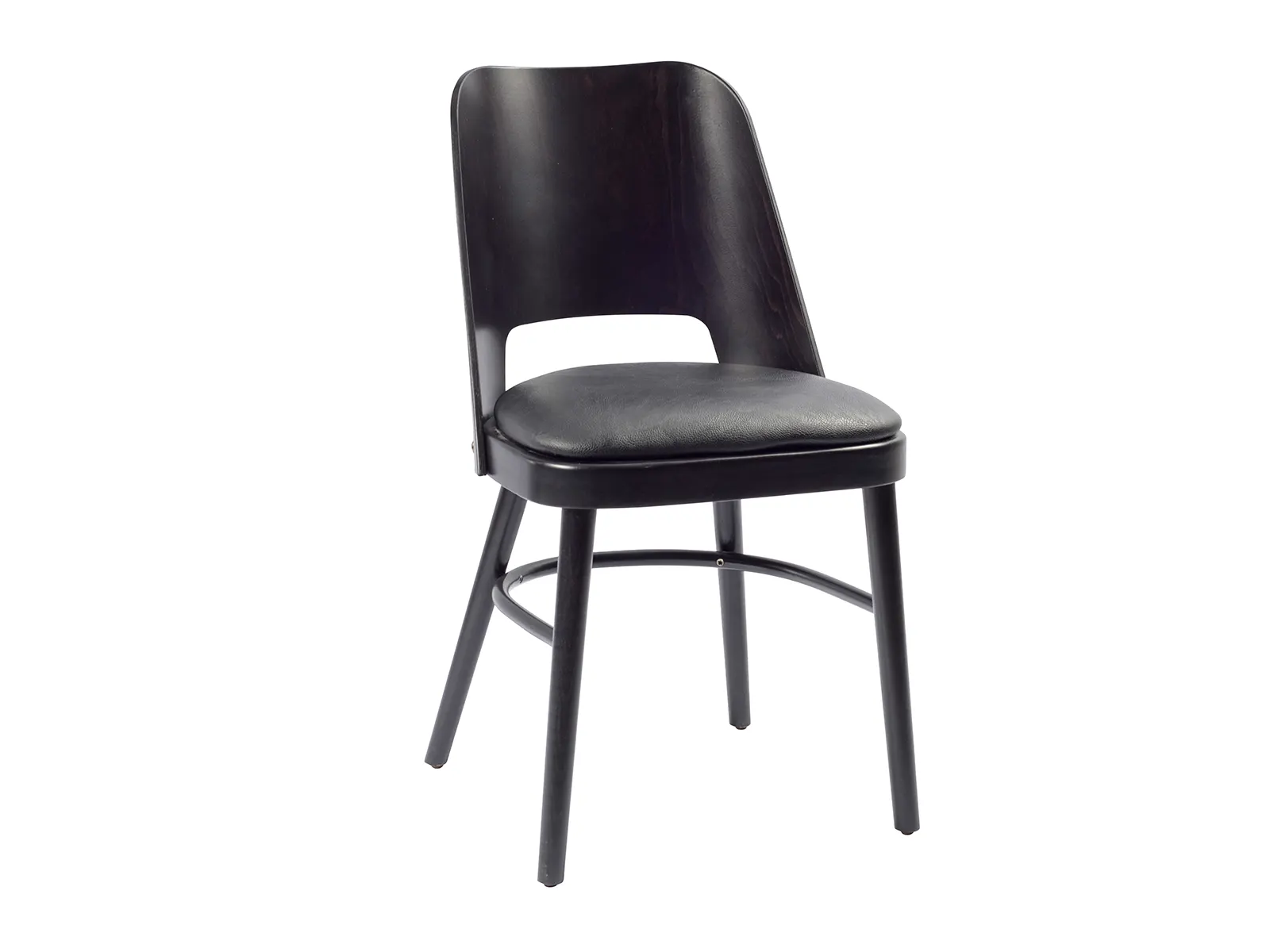 Stolička z bukového dreva, čalúnená odolnou umelou kožou, s operadlom z ohýbanej preglejky. K dispozícii v prírodnej a orechovej farbe, sedadlo z čiernej umelej kože sa ľahko čistí a nie je na ňom vidieť nečistoty. K dispozícii len po 2 ks z jednej farby.