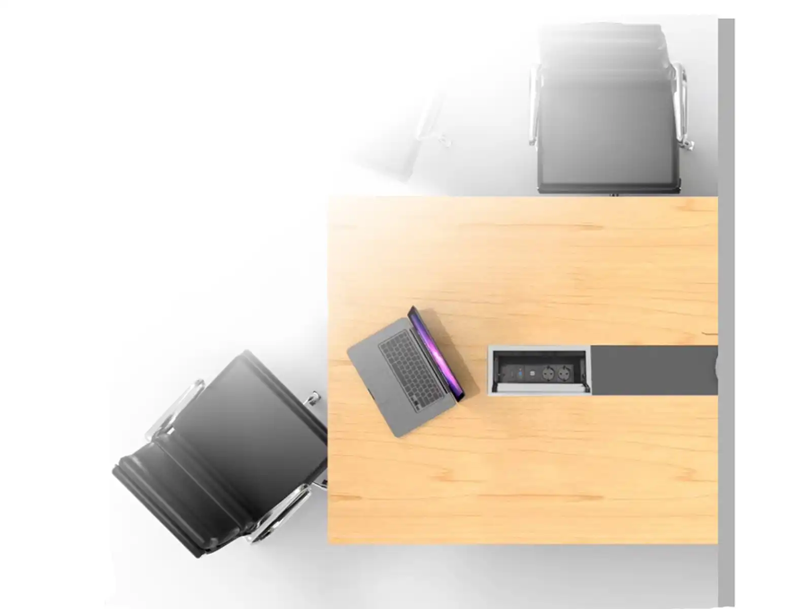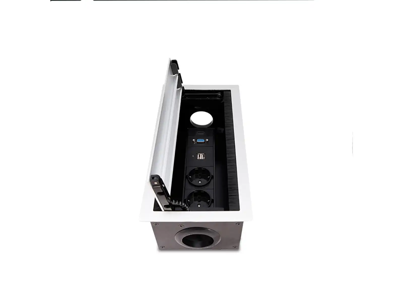 Hliníková zliatina v brúsenej striebornej farbe. Dá sa zložiť z oboch strán, takže ho môžu súčasne používať aj ľudia sediaci oproti sebe. 3x230V, 1xUSB-A, 1x USB-C, so sieťovým káblom (1,5 m).