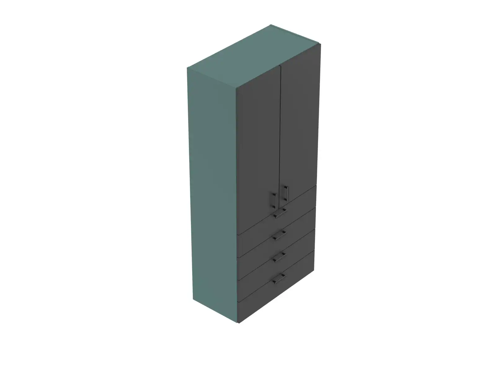 Korpus, dvierka a predná doska zásuviek sú vyrobené z laminovanej drevotrieskovej dosky hrúbky 18 mm, s 2 mm ABS hranou. 4 zásuvky. Ku skriniam je možné objednať aj hrubšie laminované drevotrieskové dosky, ktoré zdôrazňujú jednotu skríň a stolov.