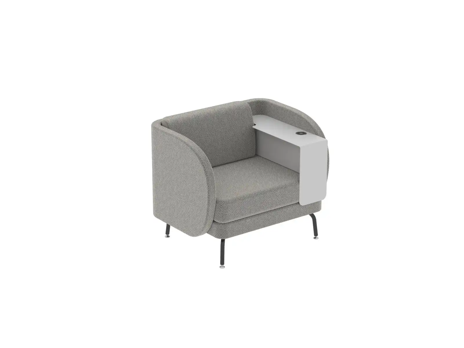 Pohodlie a dizajn pri stretnutiach na recepcii, komunitnom priestore, kancelárii alebo zasadacej miestnosti. Je lákavo pohodlný, no zároveň funkčný a praktický. Vhodný ako relaxačný nábytok na prestávky, úlohy vyžadujúce sústredenie, alebo len na telefonický rozhovor. Môže byť aj miestom pre spontánne diskusie, no zároveň vytvára príležitosť pre súkromnú sféru, alebo ak chceme len trochu pokoja a pohody. Nosná konštrukcia je vyrobená z drevotriesky hrúbky 16 mm, uzavretá časť zakrivených častí zaisťuje trvanlivosť formy. Konštrukcia nôh je vyrobená z elektrostaticky práškovo lakovanej 25 mm oceľovej trubky s chrómovými rektifikačnými podložkami na koncoch nôh. Sedák a operadlo sú vyrobené z 15 cm hrubej peny, vonkajšie plochy sú potiahnuté molitanom 1 cm a vnútro lakťovej opierky 2 cm molitanom. Celoplošne používame vysoko oteruodolné čalúnenie. Koleno je vyrobené z elektrostaticky práškovo lakovaného ohýbaného, ??tvarovaného 2 mm oceľového plechu s QI a USB nabíjačkou.
