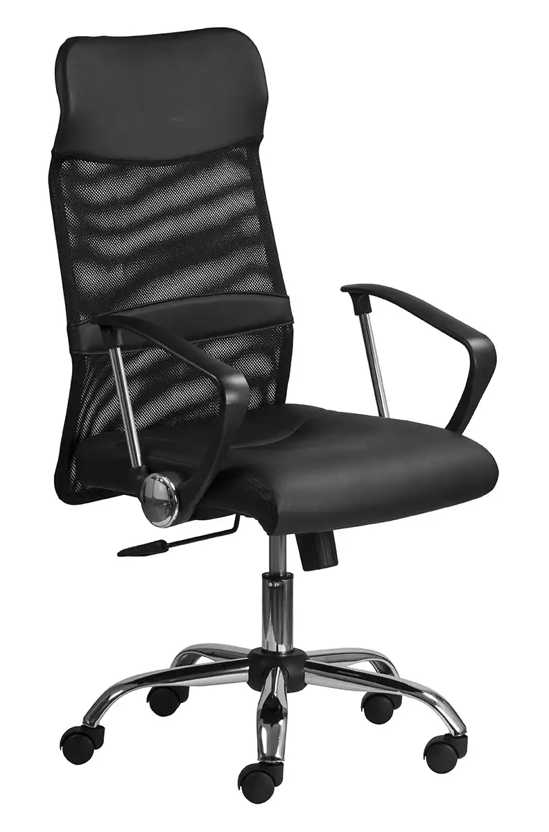Vysoké operadlo, hojdací mechanizmus s nastavením sily protiváhy, bedrová opierka. Oceľová chrómovaná báza, kolieska pre mäkké povrchy, čierna sieťovina a látka na sedadle, nosnosť 120 kg.