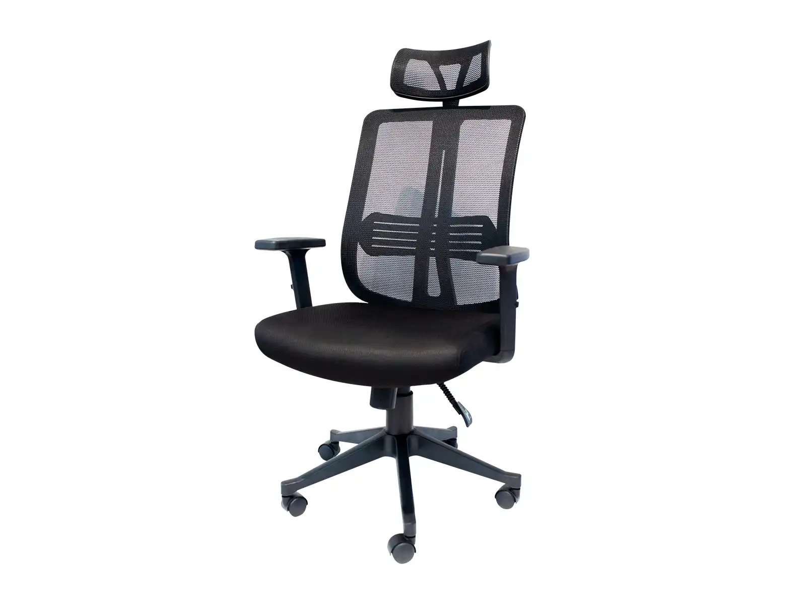 Kancelárska stolička s vysokým sieťovinovým operadlom, výškovo nastaviteľná opierka hlavy, fixná bedrová opierka, čierny mesh sedák, 2D výškovo nastaviteľné podrúčky, nastavenie uhla a výšky operadla, ergonomická, plynový piest, čierny plastový kríž, nosnosť 110 kg