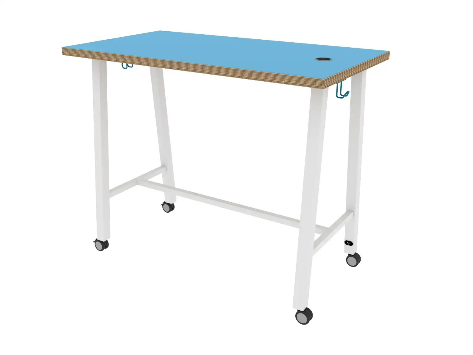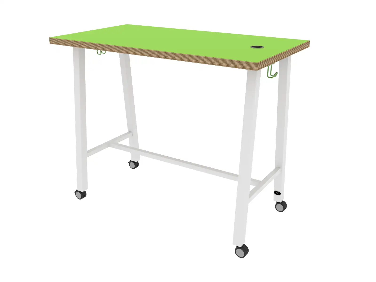 Konštrukcia z kovovej jokloviny 50x50 mm. Doska stola je preglejka hrubá 15 mm, obojstranne potiahnutá dekritovou vrstvou, hrany vyfrézované, povrchovo upravené ľanovým olejom. Na doobjednanie bezdrôtová USB nabíjačka, na obidvoch stranách háčik na tašku. 2 kolieska s brzdou
