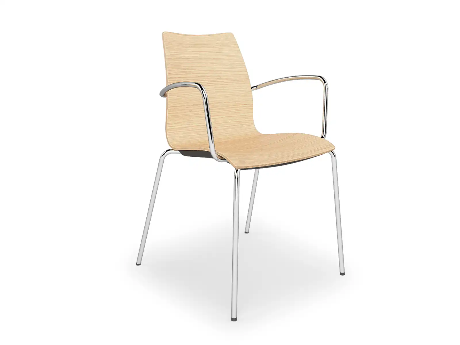 Stolička z prírodnej bukovej preglejky s chrómovanými kovovými nohami, s podrúčkami, 4 nohy. Konštrukciu je možné objednať v hliníkovej alebo čiernej farbe a plášť v rôznych farbách. Za príplatok si ju možno vyžiadať s podložkou na písanie alebo podrúčkami, ako aj vo verzii barovej stoličky alebo s lyžinovými nohami.