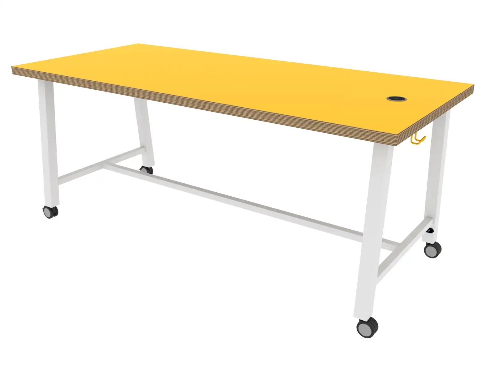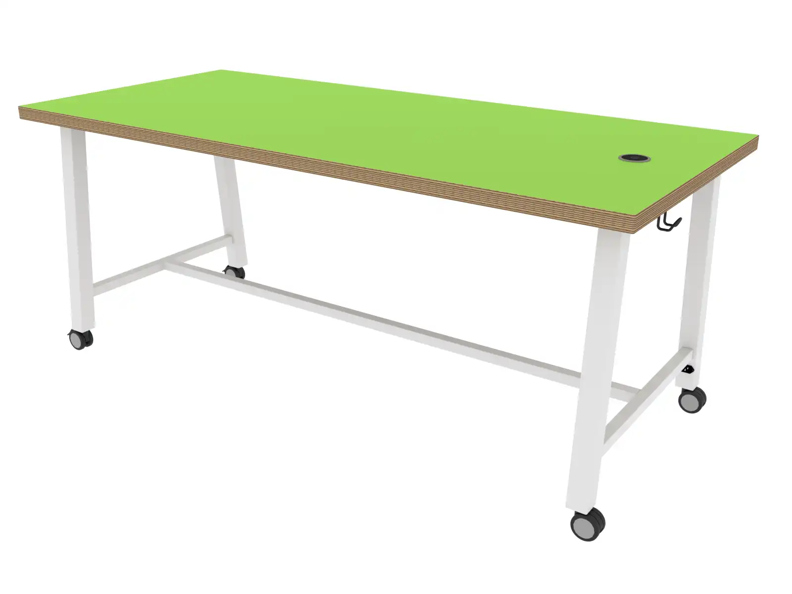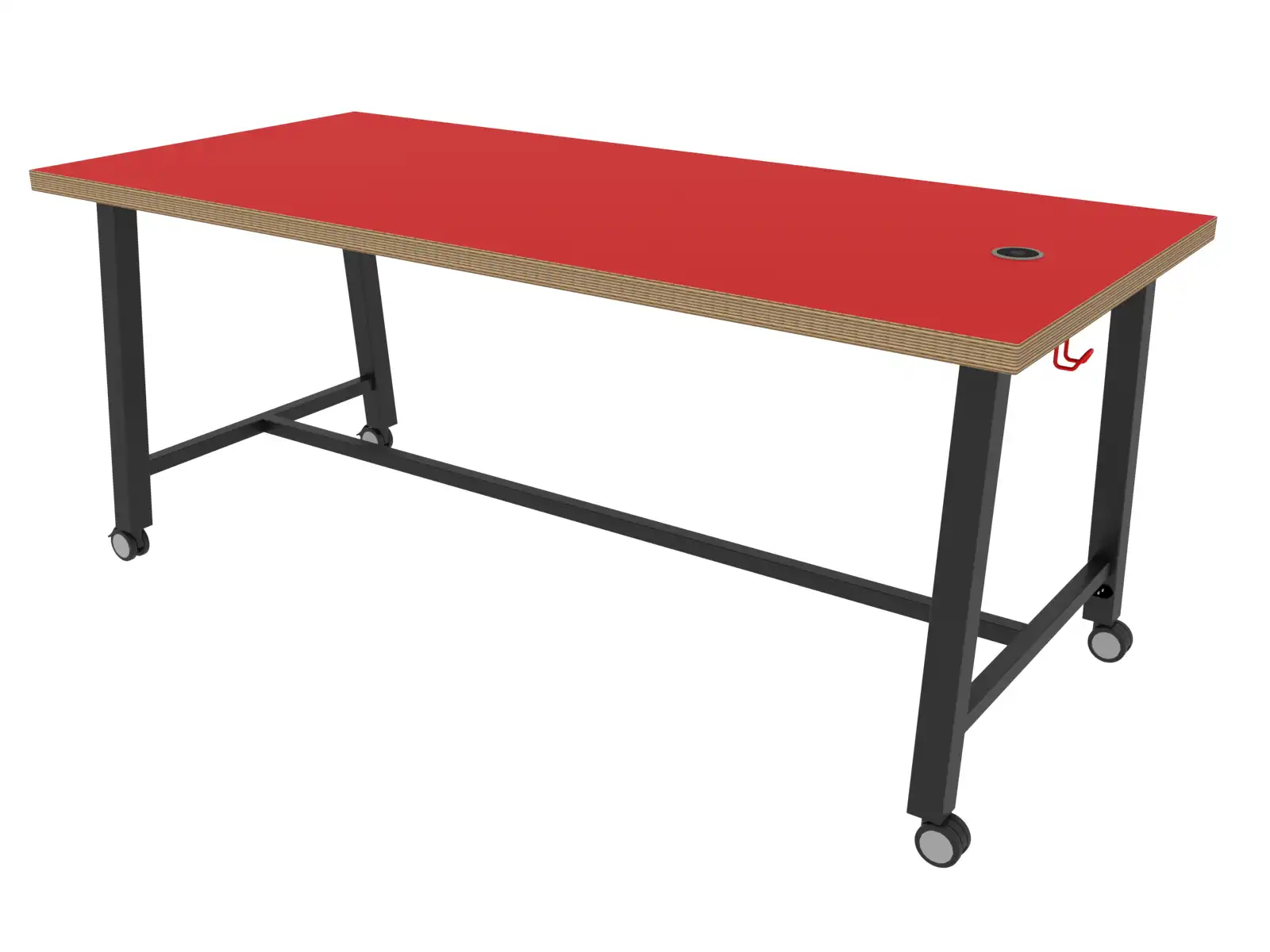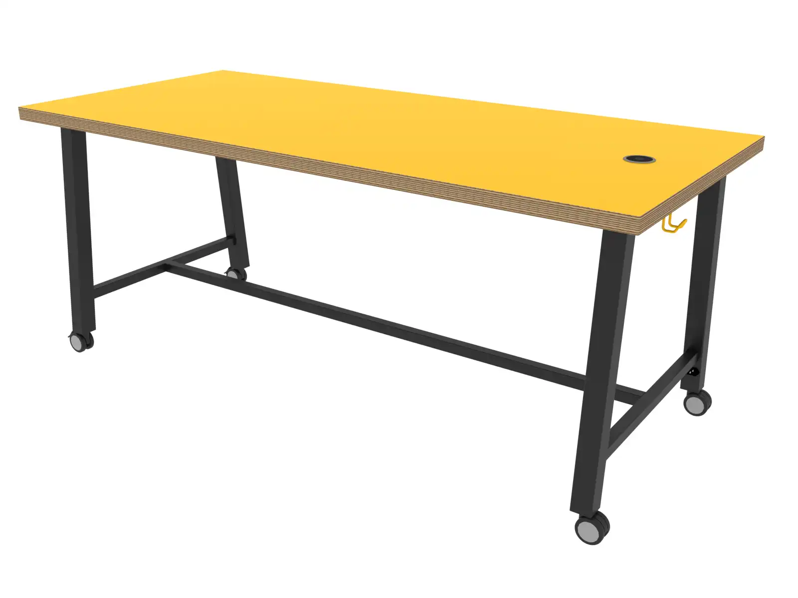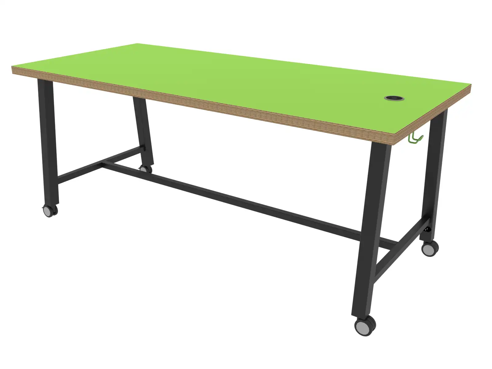 Konštrukcia z kovovej jokloviny 50x50 mm. Doska stola je preglejka hrubá 15 mm, obojstranne potiahnutá dekritovou vrstvou, hrany vyfrézované, povrchovo upravené ľanovým olejom. Na doobjednanie bezdrôtová USB nabíjačka, na obidvoch stranách háčik na tašku. 2 kolieska s brzdou